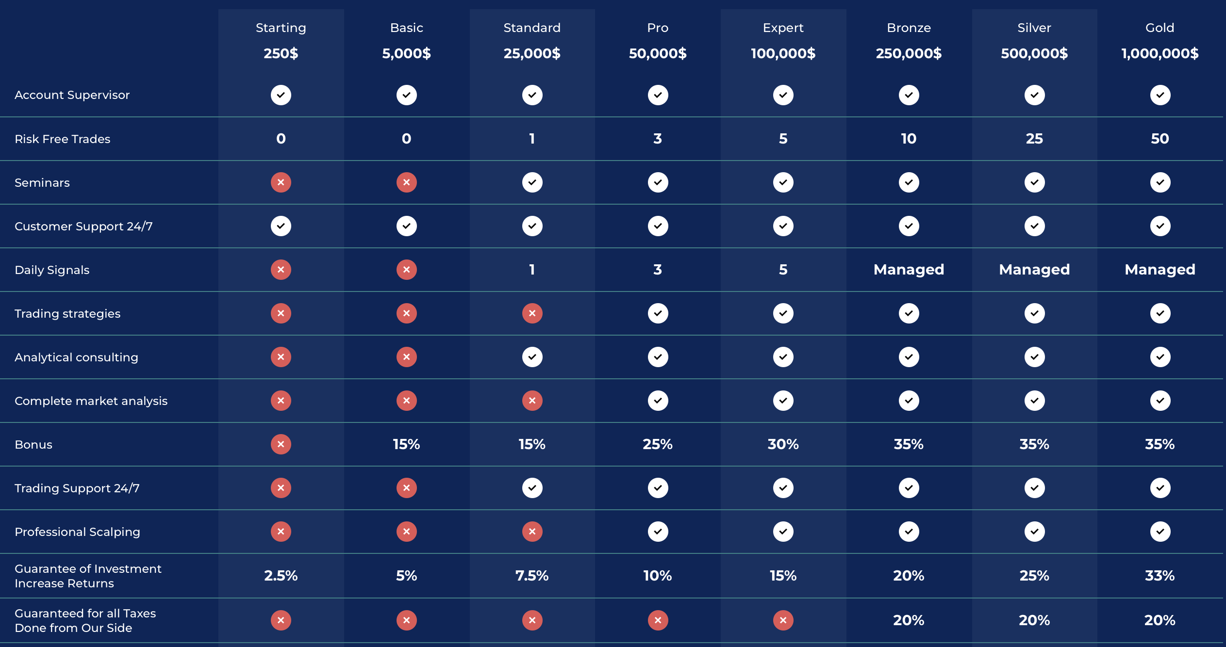 The Nova Trade administration advertises several trading account types that differ in deposit size and available services. After registration, traders can choose among various options — Starting, Basic, Standard, Pro, Expert, Bronze, Silver, and Gold.
